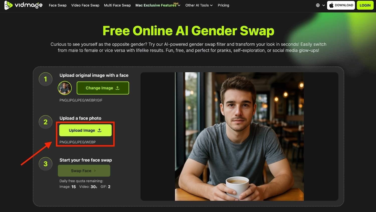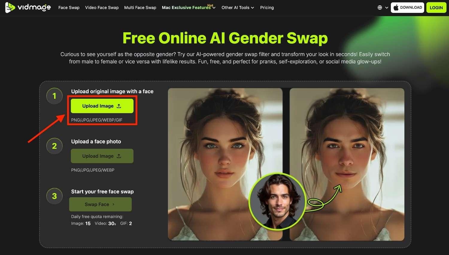 Step 1: Go to the VidMage's gender swap page and click on the ‘Upload Image’ to add the original photo with a clear face.